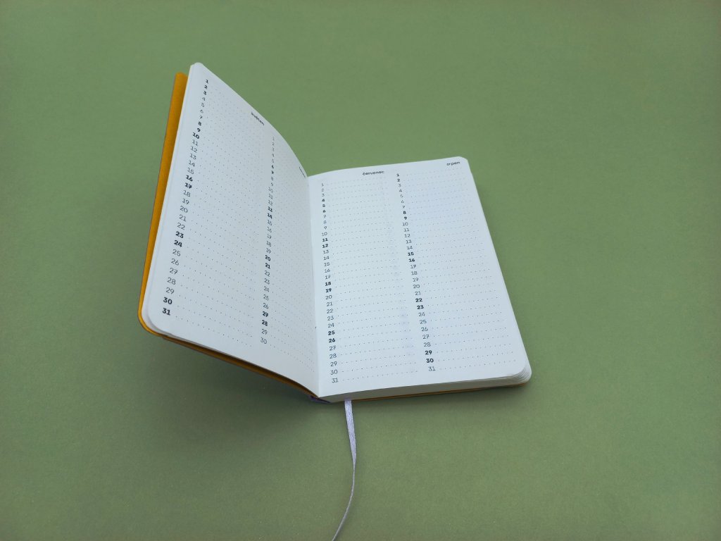 - kalendárium: levá stránka - týdenní kalendárium, pravá stránka - tečky